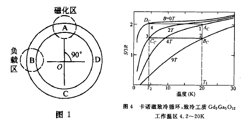 如图4.卡诺循环是用绝热去磁和绝热磁化两个过程来接两个等温过程的.D->A绝热磁化,系统的熵不变.此过程因为△SB<0,所以△ST > 0.系统温度由T,升至T2. A->B继续磁化并等温放热,系统的熵下降.B->C是绝热去磁过程,系统的熵不变,由于工质从磁有序变为磁无序,所以△SB>0, △ST<0.系统温度由T2孔降到T1,C->D继续退磁直至撤出外磁场,系统吸热保持低温,工质回到初态.致冷系数为ε=T2/T1-T2。