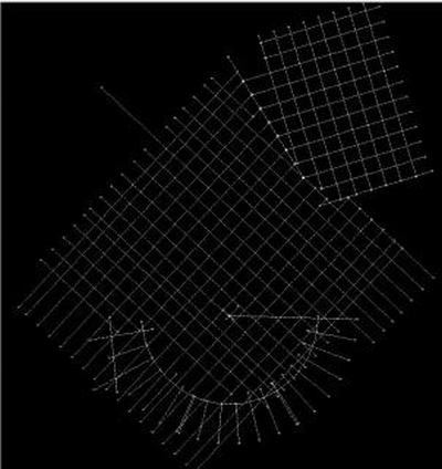● 这里我们拿的是一个两栋单体异形建筑来说明,链接进来后,可以看到建筑的造型很奇特,其轴网也非常规的横平竖直,除了各单体的轴网外还有一套总控制轴网